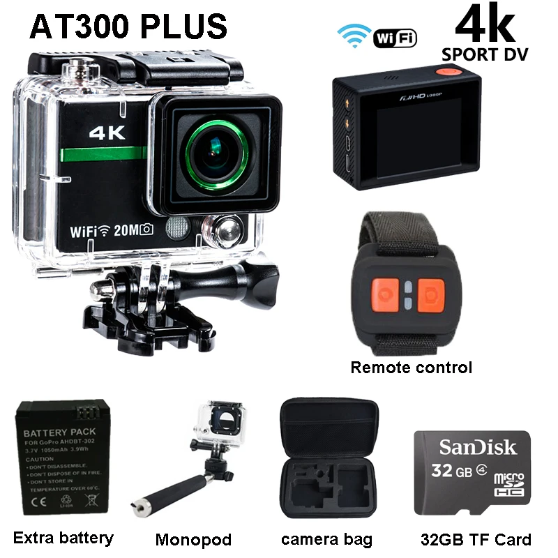 Main Features : Original Action Cam 12MP 4K 15fps Full HD 1080P AT300 Plus Wifi Sports Camera 30 m waterproof Remote controller controlling
