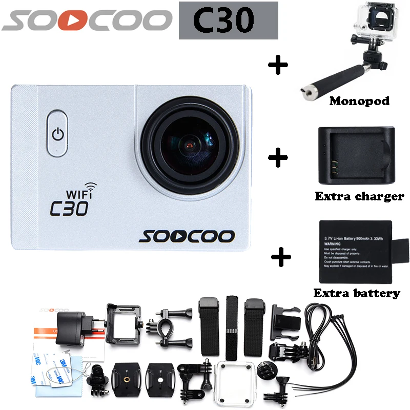 Main Features : Free Shipping!!! SOOCOO C30 Camera Wifi Ultra HD 16MP 4K Adjustable Waterproof Outdoor Action Cam Add Monopod +2Battery +charger