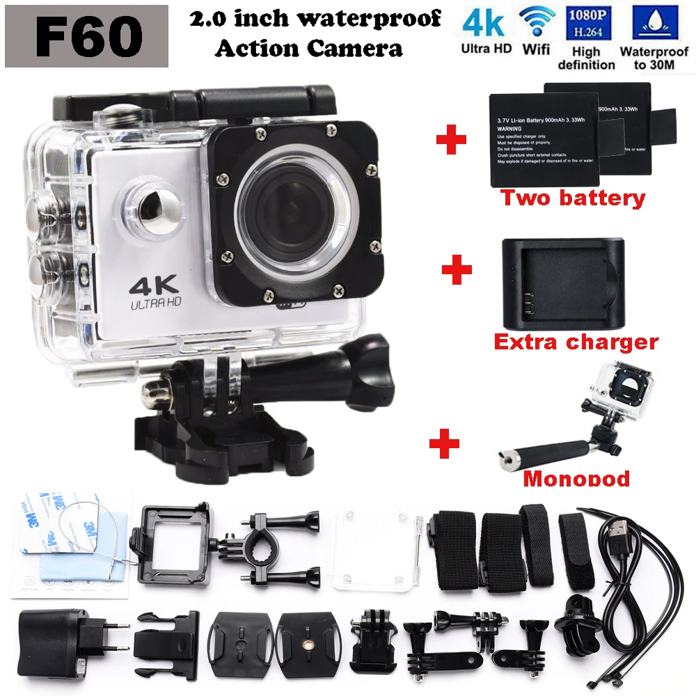 Article Review : Hot sale hero 4 style Camera 4K F60 WiFi Action Cam Ultra HD 16MP 2 inch Screen Waterproof 30M Add Two battery+charger+Monopod